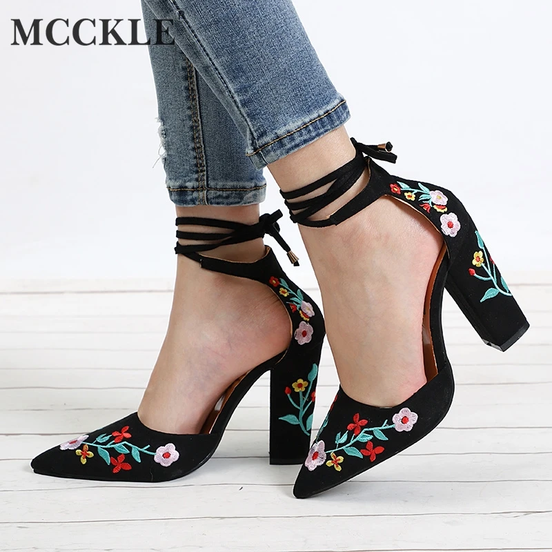 Special Offer MCCKLE mujeres tacones altos de talla grande bombas bordadas flor tobillo Correa Zapatos Mujer dos piezas Sexy fiesta boda punta puntiaguda Discount 31% Today!