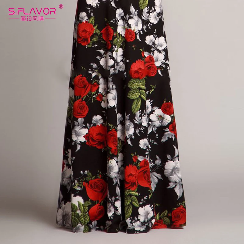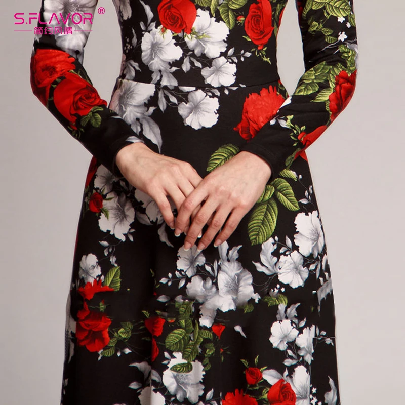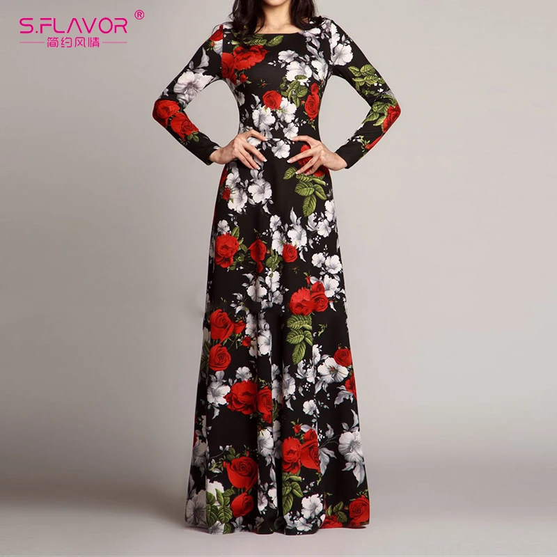Special Offer S. FLAVOR mujer elegante cuello redondo vestido largo Casual manga larga Vintage Floral impreso Maxi vestido Otoño Invierno Vestidos de fiesta delgados Discount 47% Today!