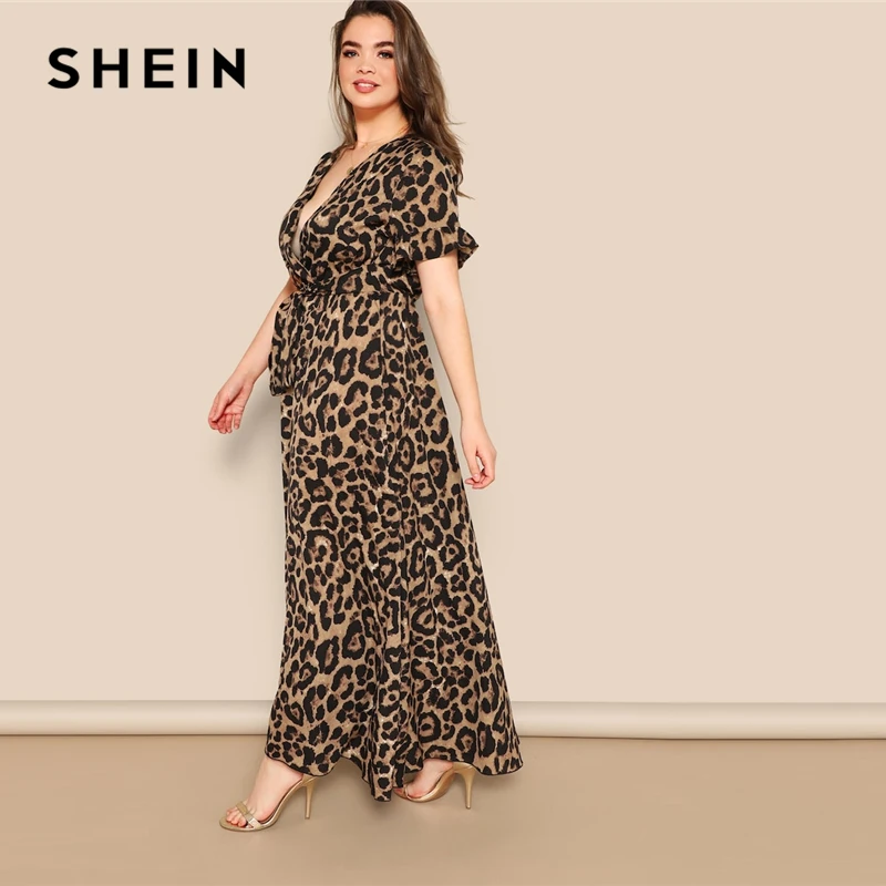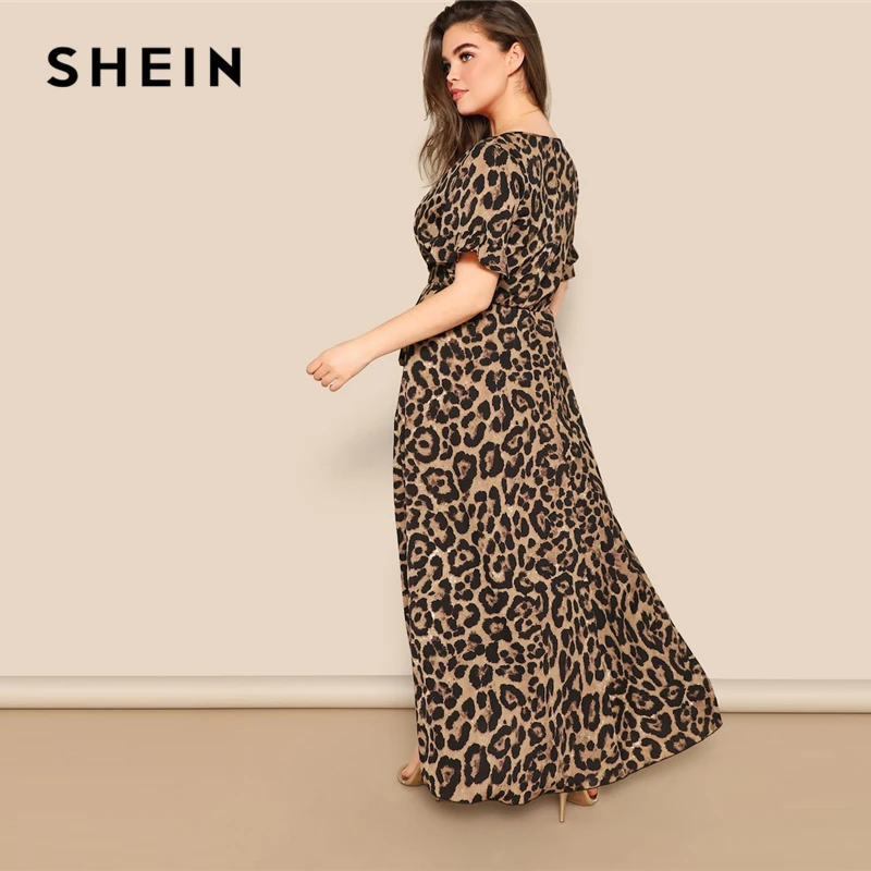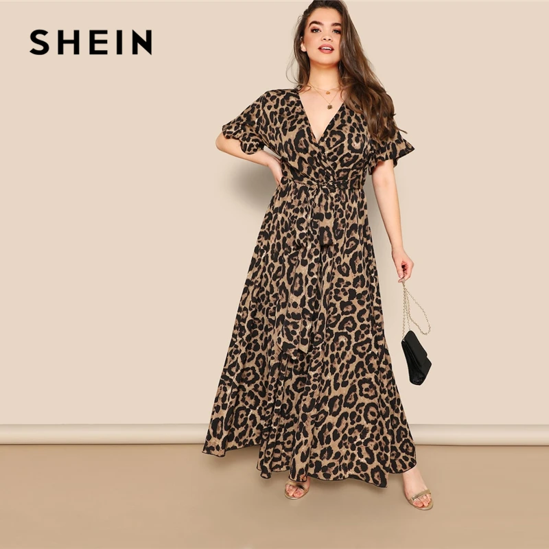 Special Offer SHEIN mujeres de talla grande volantes manga Tie Waist Surplice Wrap leopardo una línea vestido primavera Multicolor vestidos de cintura alta Discount 45% Today!
