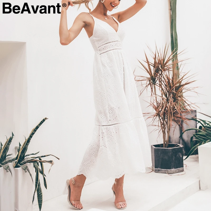 Special Offer BeAvant bordado algodón blanco verano Vestido Mujer Sexy cuello pico espagueti vestido largo con tirantes de cintura alta botón casual vestido femenino Discount 46% Today!