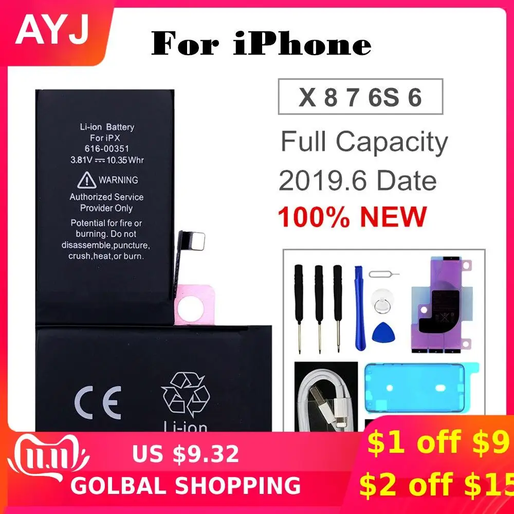 Special Offer 1 batería Original AYJ para iPhone X 7 8 6S 6 reemplazo Real de alta capacidad baterías de teléfono móvil gratis herramientas de Cable Usb Discount 41% Today!