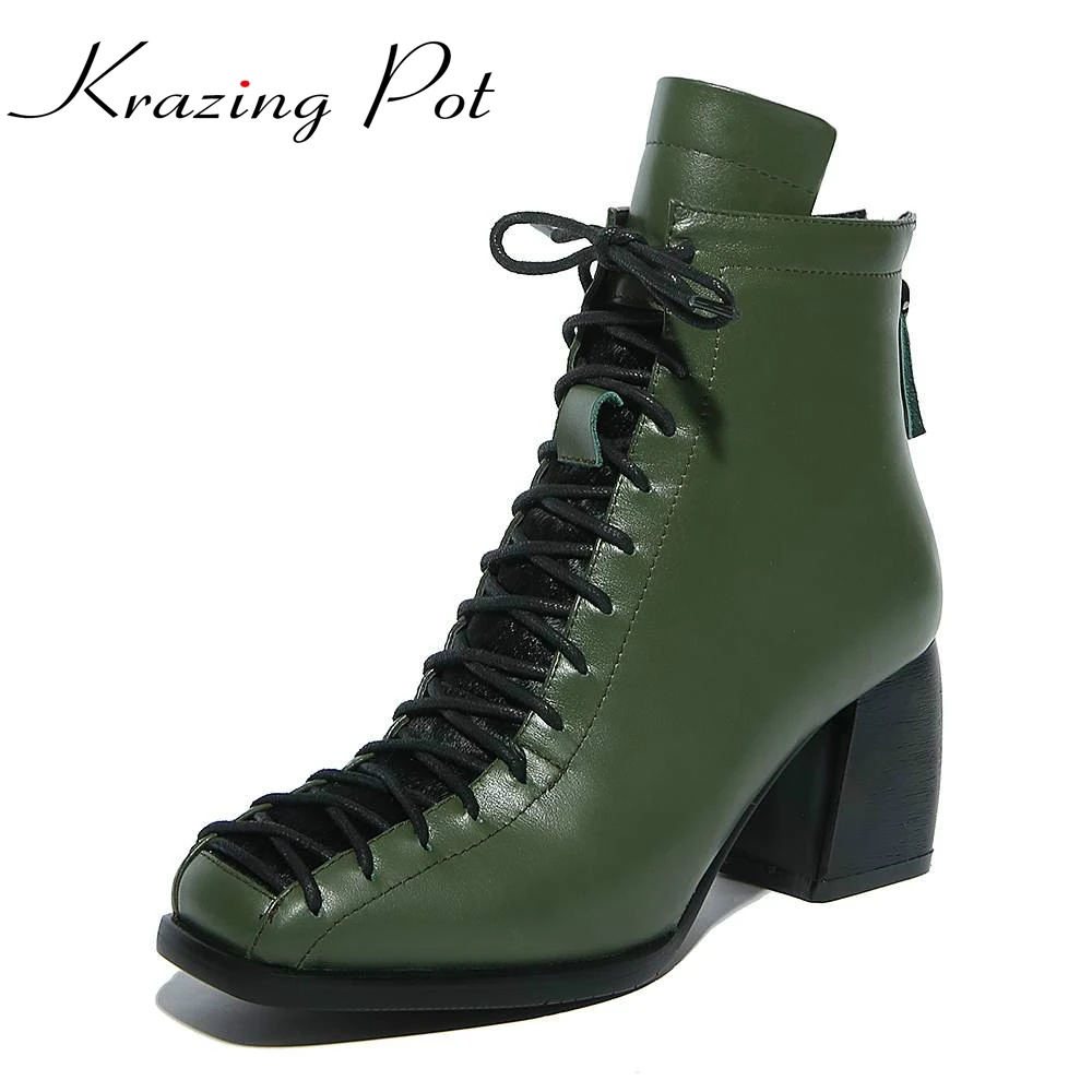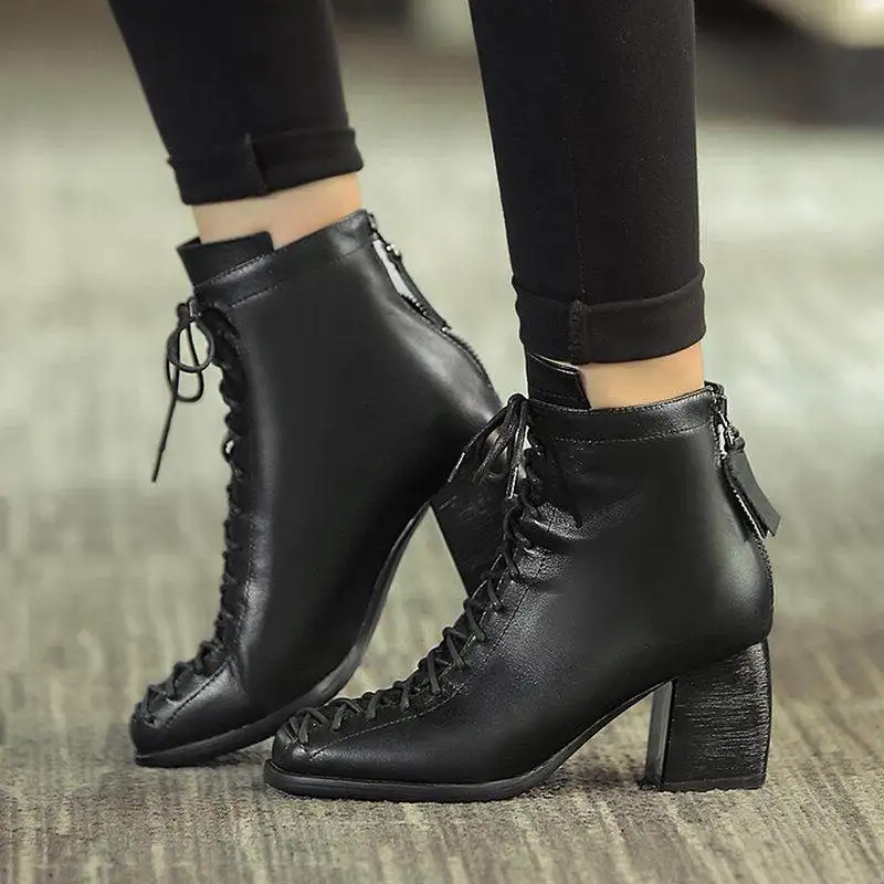 Special Offer Botas de tobillo de mujer color sólido de cuero genuino con cordones de punta cuadrada a la moda zapatos de mujer de marca de tacón grueso botas de motocicleta causal L74 Discount 50% Today!