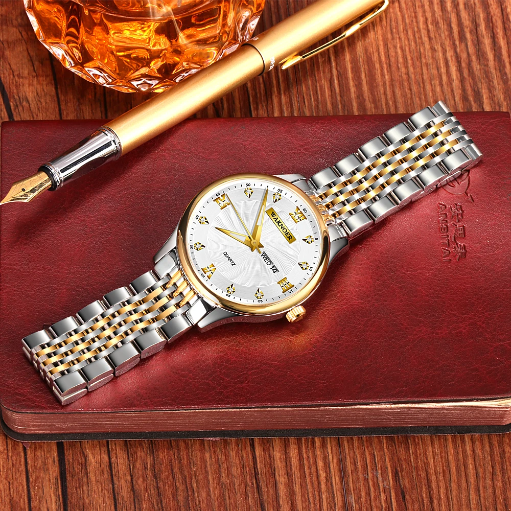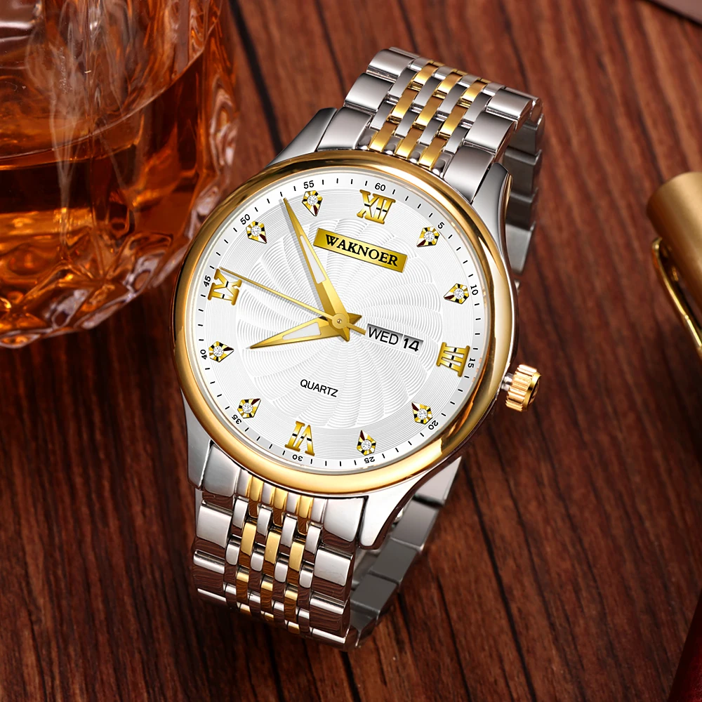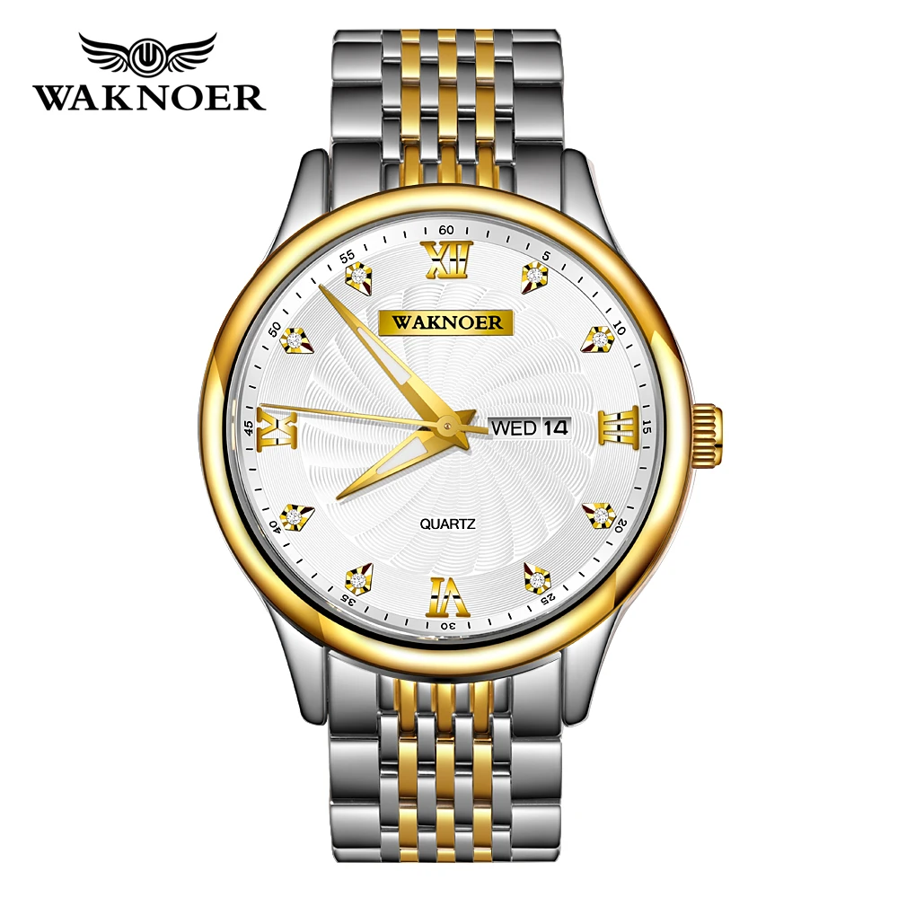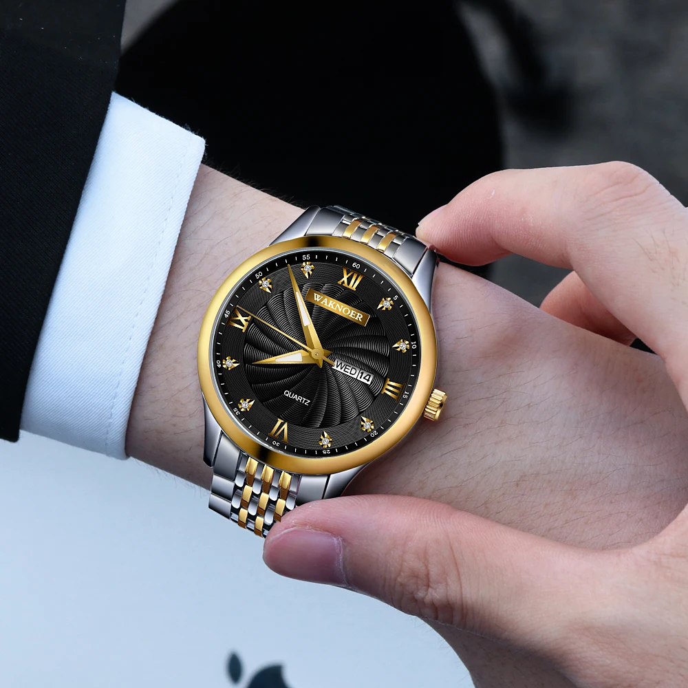 Special Offer Reloj de cuarzo WAKNOER, Reloj de moda para hombres, esfera espiral de oro y diamante, luminoso, visualización automática de fecha y semana, marca superior, Reloj de lujo Discount 50% Today!