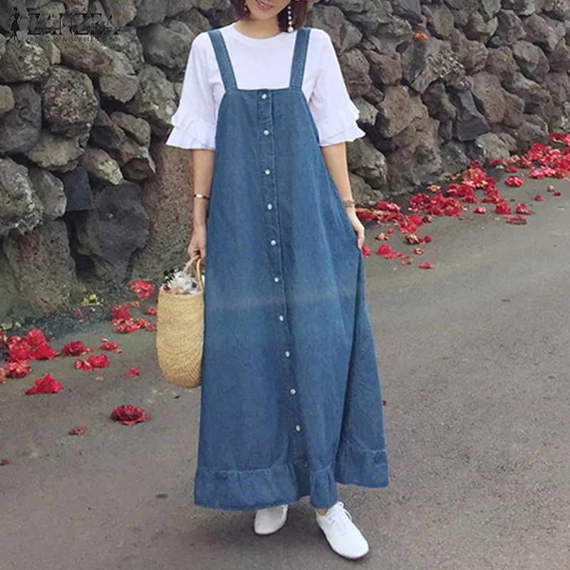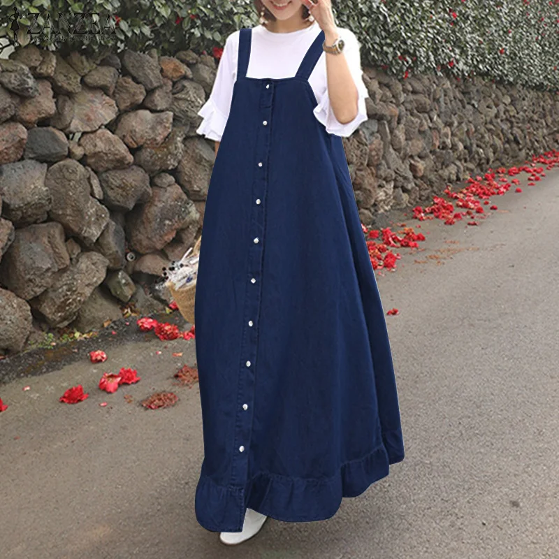 . (31% Off) Comprar ZANZEA mujeres Denim estilo overol Vestido de verano Vintage volantes dobladillo Maxi largo Vestido Casual correas botones sólido Vestido holgado Online Baratos.