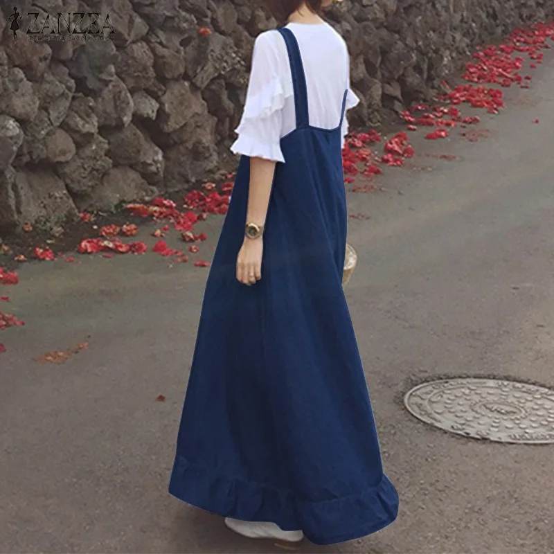 Special Offer ZANZEA mujeres Denim estilo overol Vestido de verano Vintage volantes dobladillo Maxi largo Vestido Casual correas botones sólido Vestido holgado Discount 31% Today!
