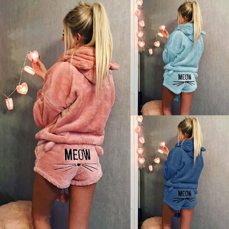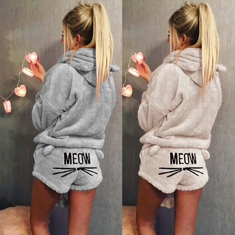 . (35% Off) Comprar Swokii conjuntos de pijama para mujer 2019 Otoño Invierno franela pijamas calientes de dibujos animados Animal ropa de dormir gato pijama femenino con capucha ropa de casa Online Baratos.