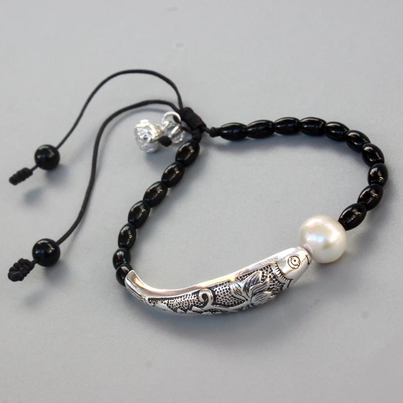 Special Offer Perla Natural de piedra negra al por mayor con pulsera de plata de la suerte del pez para mujeres Yoga meditación joyería de muñeca hecha a mano única Discount 0% Today!
