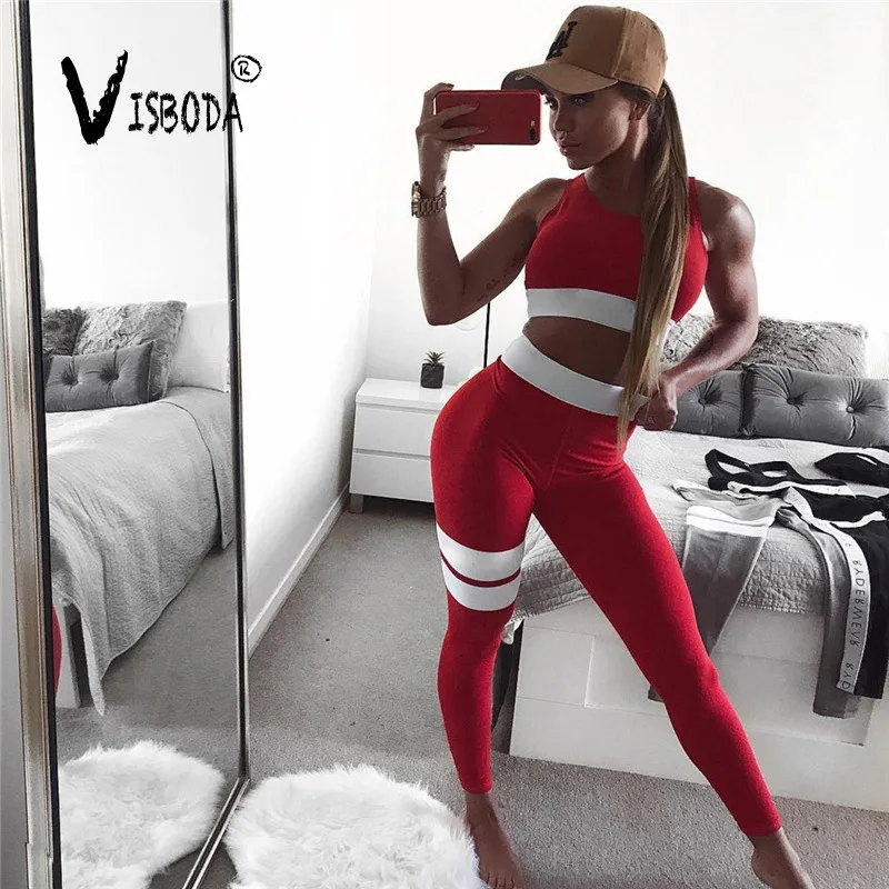 Special Offer Las mujeres de Fitness trajes pantalones tanque entrenamiento Bra Top y Legging pantalones 2 piezas conjunto de moda mujer rojo rayas Sexy chándal Discount 15% Today!