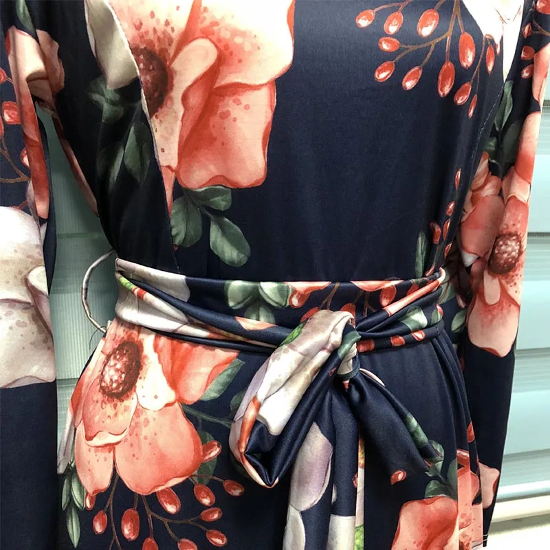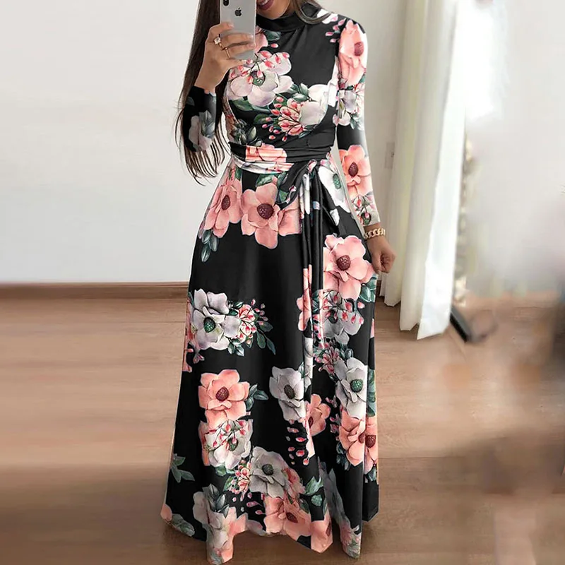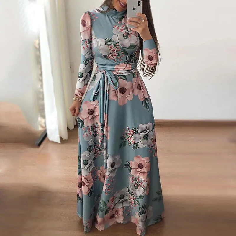Special Offer Vestido Mujer cuello redondo estampado Floral manga larga Maxi vestidos largos imperio fajas Casual vendaje otoño Vestido Mujer fiesta Bata Discount 35% Today!
