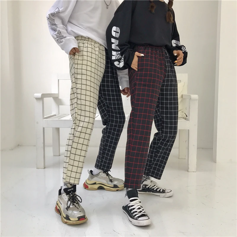 Special Offer Harajuku pantalones Patchwork pantalón de cuadros mujeres cordón cintura elástica Pantalón recto otoño moda prendas de vestir Discount 20% Today!
