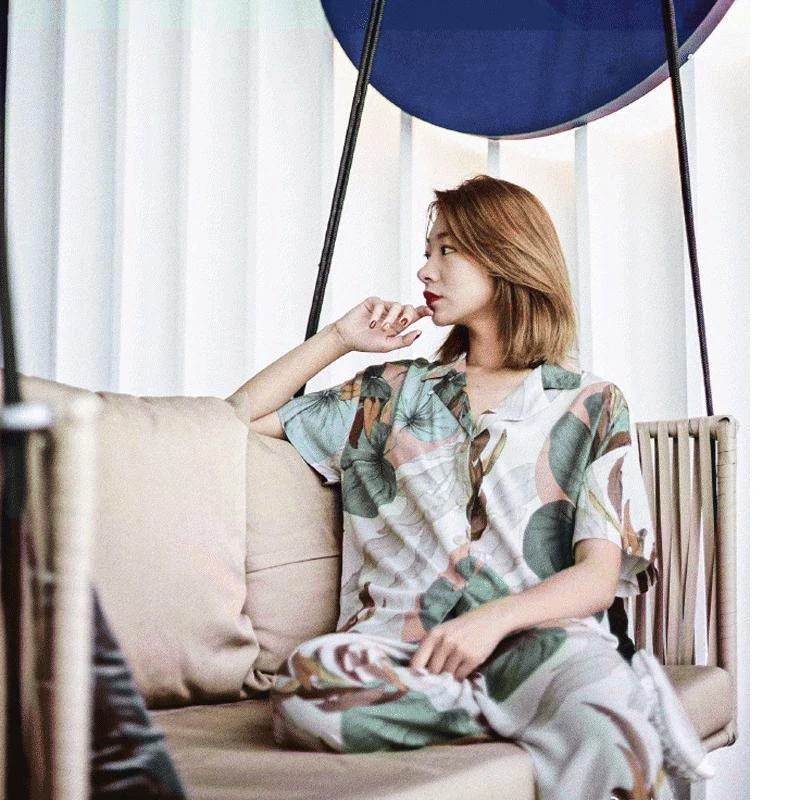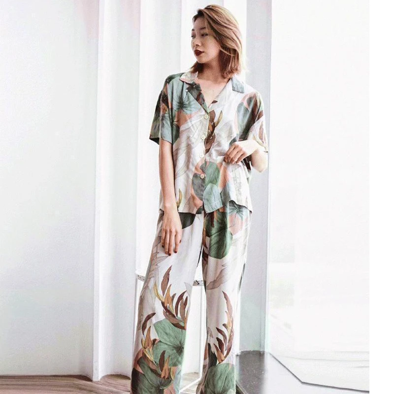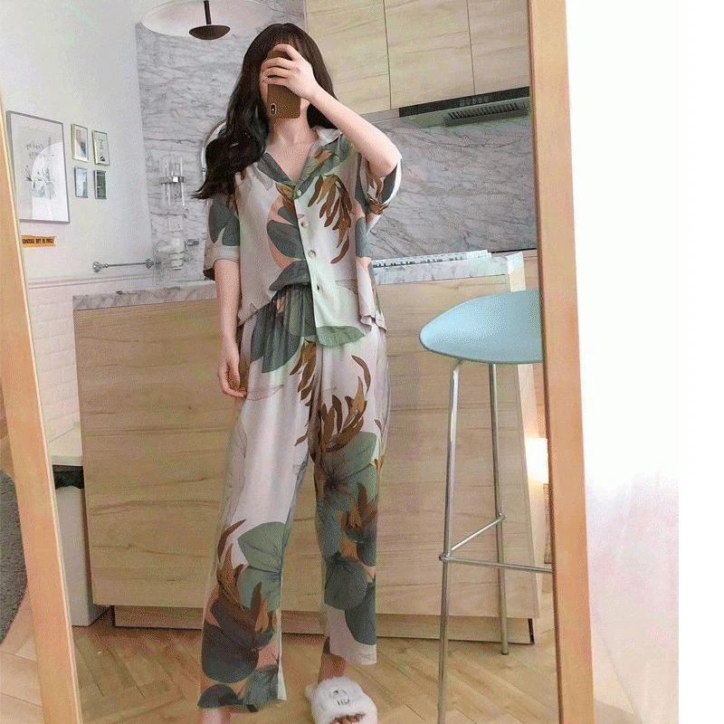 Special Offer Nuevo pijama de verano 2019 para mujer, Pijamas con estampado de hoja de palma, pantalones de manga corta, Pijamas, ropa de dormir Sexy, juego de dormir en casa Discount 20% Today!