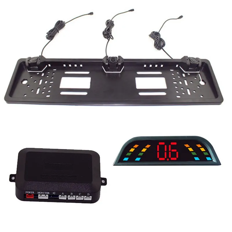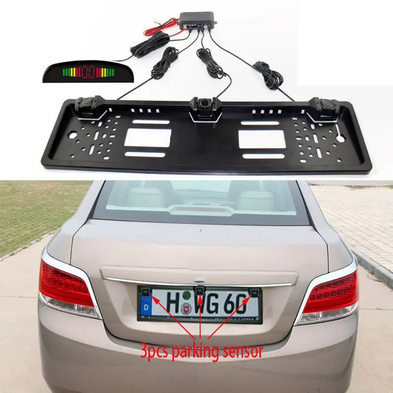 . (35% Off) Comprar Kit de sensores de aparcamiento de coche Radar de Inversión automática placa de matrícula europea cámara frontal Trasera Sistema de Monitor electromagnético 3 sensores Online Baratos.