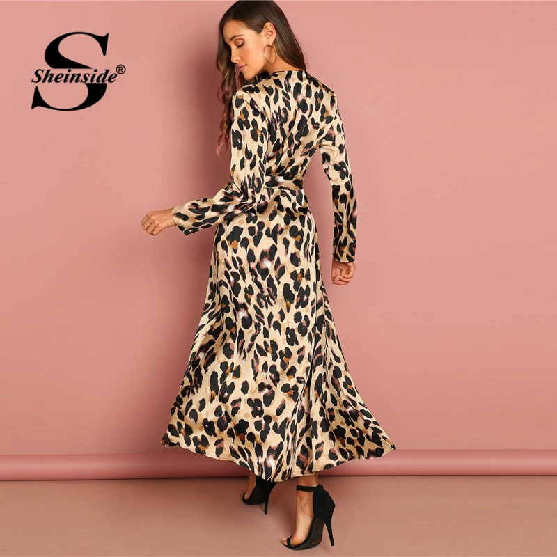 Special Offer Vestido de leopardo satinado con estampado de leopardo para mujer, vestidos de verano de manga larga para mujer, vestido largo con cuello en V profundo de noche de fiesta para mujer Discount 40% Today!