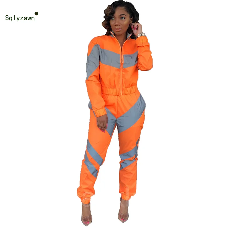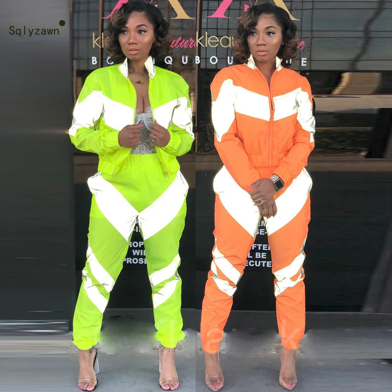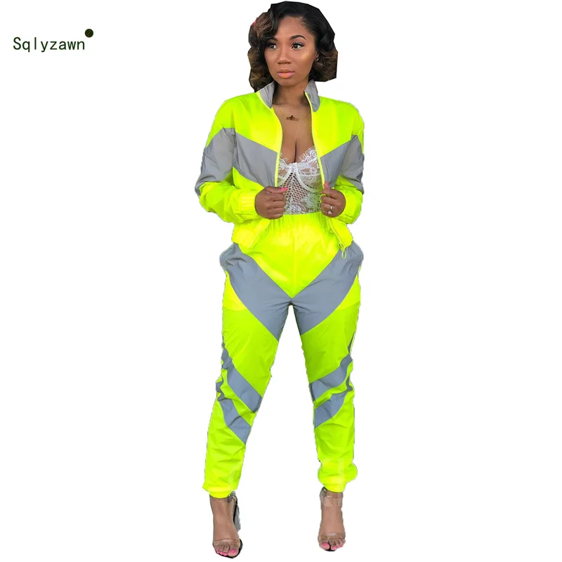 Special Offer Chaqueta verde fluorescente de manga larga de mujer conjunto de 2 piezas de neón reflectante Patchwork pantalones conjunto primavera chándal con cremallera Discount 23% Today!