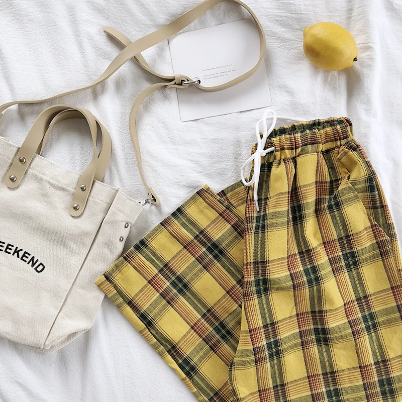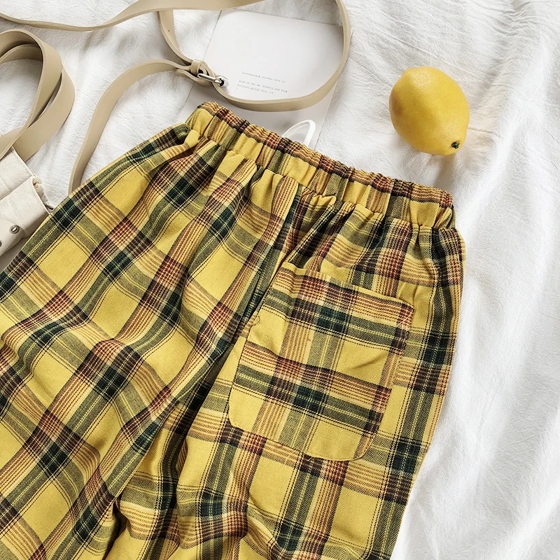 Special Offer CamKemsey Vintage amarillo Plaid japonés Harajuku verano Pantalones mujer Casual cordón longitud tobillo pantalones de algodón con pernera ancha Discount 26% Today!