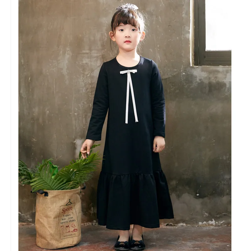 Special Offer Niños y Adolescentes niñas grandes de manga larga de algodón negro casual flare maxi vestido con pin extraíble de 3 a 16 años otoño Invierno vestido Discount 30% Today!