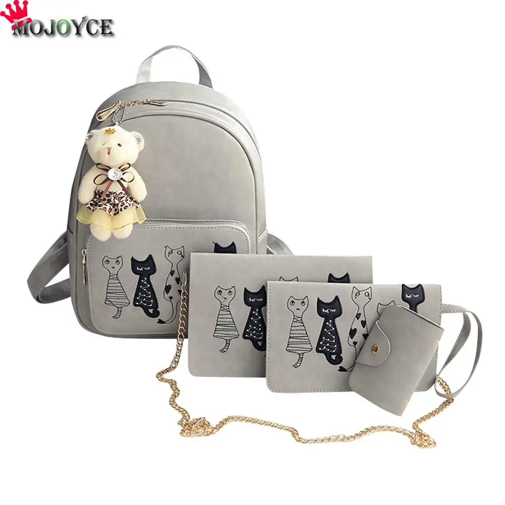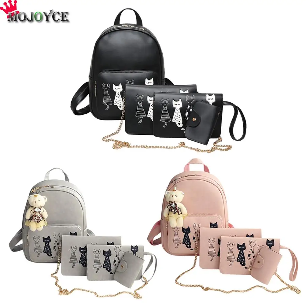 Special Offer 4 unids set Mochila mujer gato estampado cuero PU mochilas escolares estudiantes mochilas para chicas adolescentes Mochila femenina saco a Dos Mini Discount 34% Today!