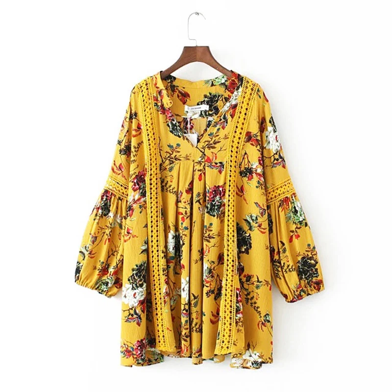 Special Offer Mini vestido bohemio amarillo teelinger vintage con estampado Floral vestidos de otoño con cuello en V manga larga marca suelta vestidos de mujer Gypsy vestidos Discount 42% Today!