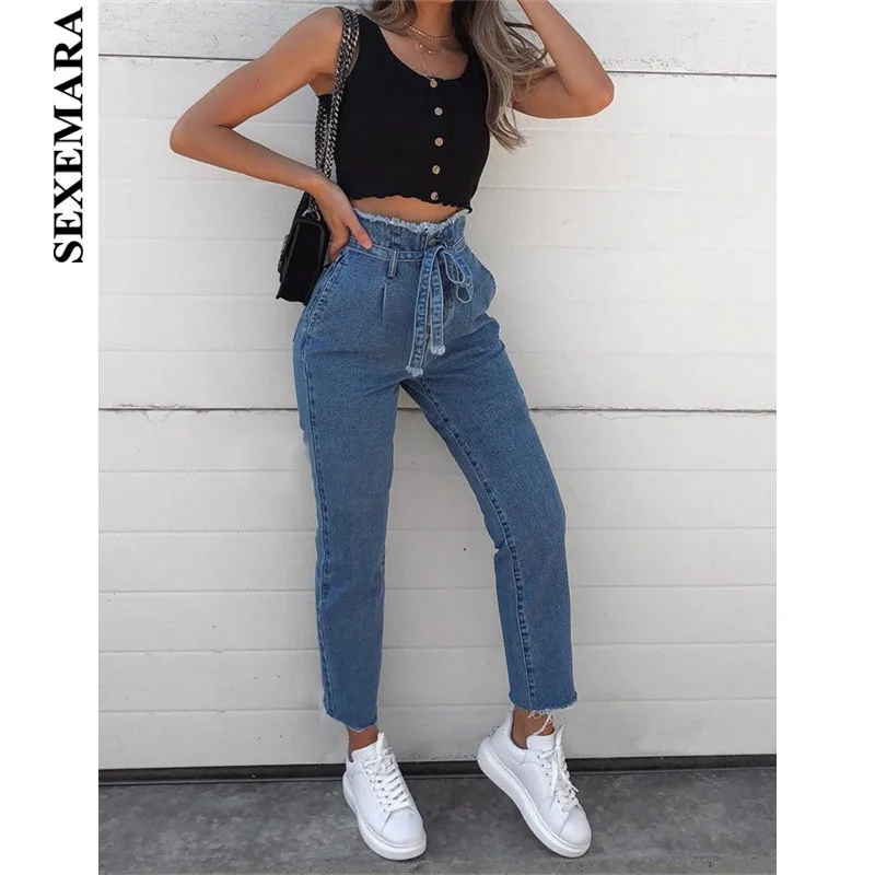 Special Offer BOOFEENAA Sashes alta cintura Jeans rasgados mujer Vintage mamá Jeans Negro Azul Streetwear otoño 2019 Casual lápiz pantalones C76 AI22 Discount 45% Today!