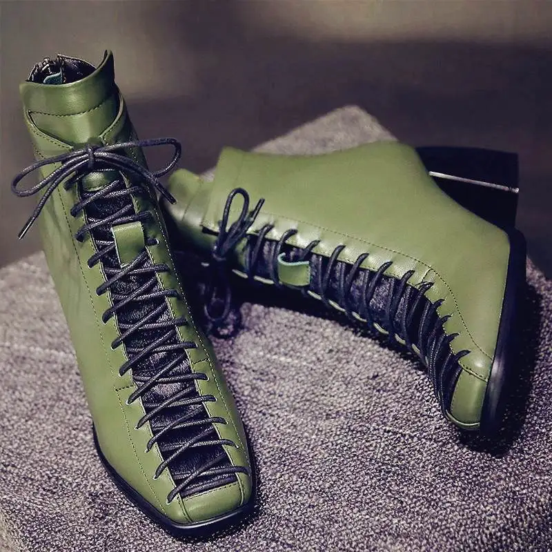 Special Offer 2019 zapatos de invierno de marca de moda de punta cuadrada de encaje de cuero genuino sólido desnudo mujeres botines zapatos de tacón grueso bota casual L74 Discount 50% Today!