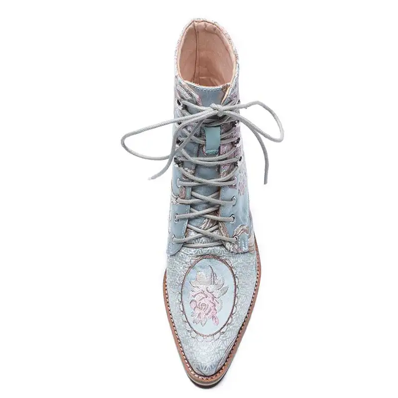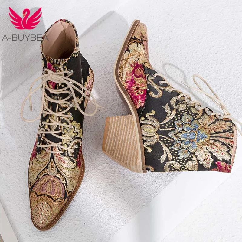 Special Offer Las mujeres de apilado de tacón alto flor bordado de encaje botas de tobillo botas zapatos de mujer zapatos de tobillo de Damas zapatos de satén de seda calzado bota Discount 60% Today!