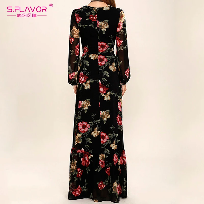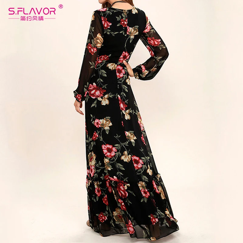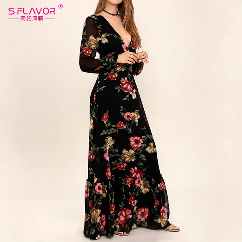 Special Offer S. FLAVOR Otoño Invierno Vestido De playa bohemio mujeres Floral impreso elegante vestido largo cuello en V sexy manga larga casual Vestidos De Discount 41% Today!