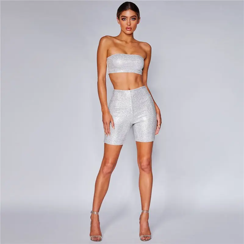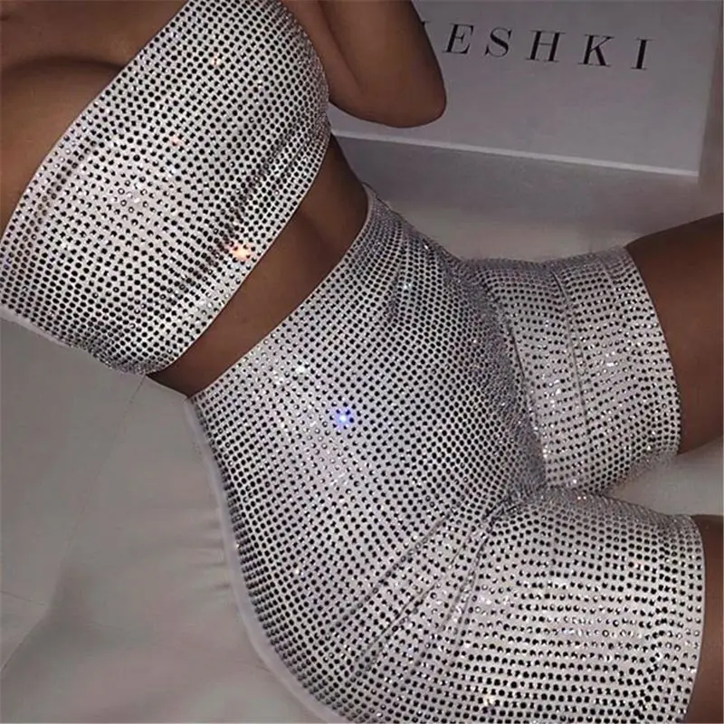 Special Offer ZKYZWX brillante lentejuelas, conjunto de dos piezas de hombro Tops + pantalones traje de verano para mujer trajes Sexy fiesta noche Club conjuntos Discount 30% Today!